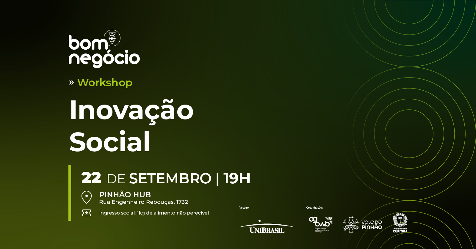O Bom Negócio – Inovação Social é um evento prático, dinâmico e feito sob medida para quem quer aprender como unir empreendedorismo + propósito + inovação para criar soluções relevantes, sustentáveis e que realmente fazem a diferença.